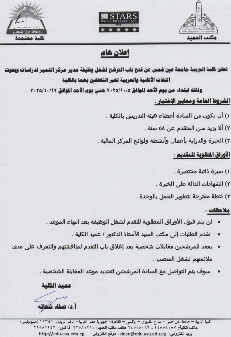 فتح باب الترشح لشغل وظيفة مدير مركز التميز لدراسات وبحوث اللغات الألمانية والعربية لغير الناطقين بهما بالكلية